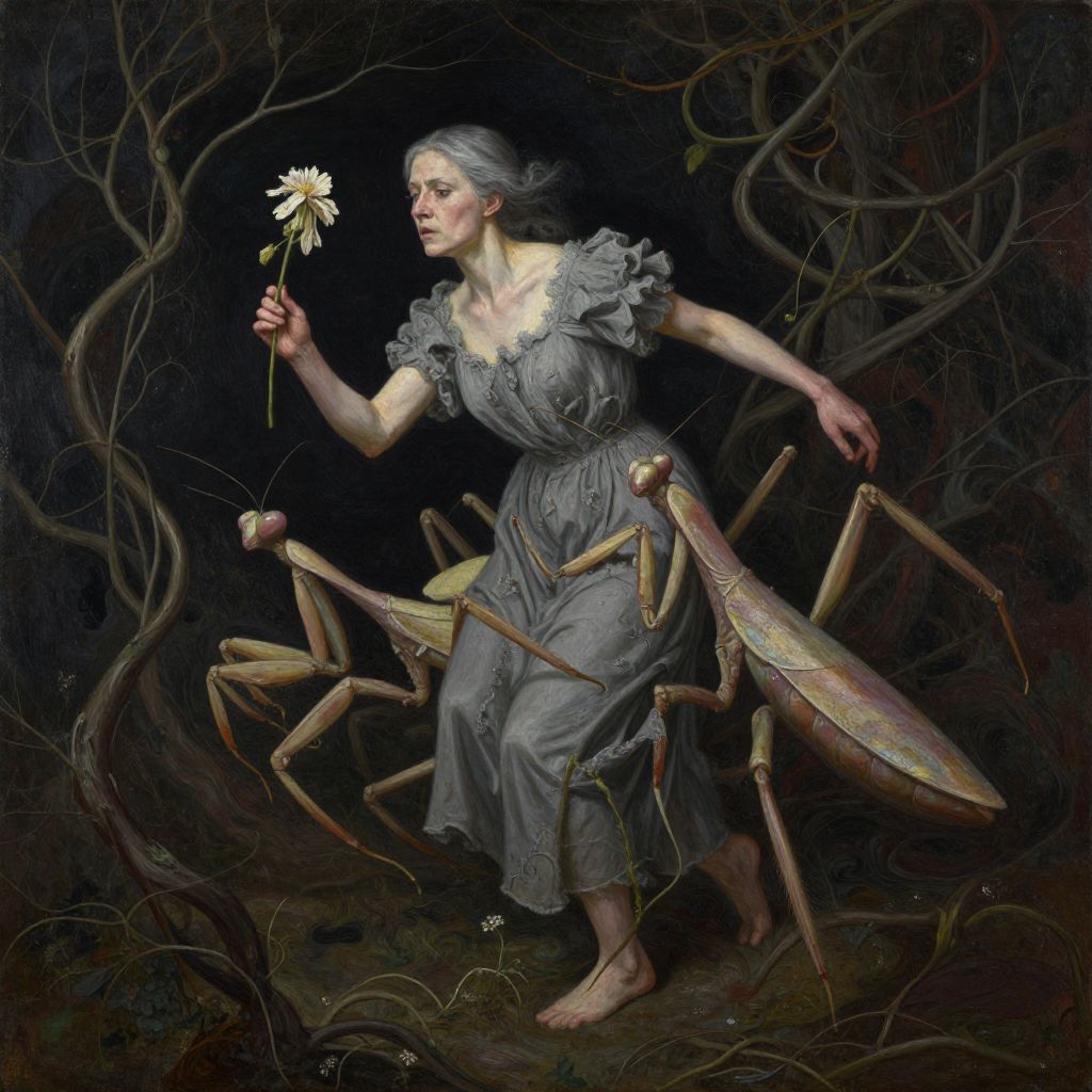 In this striking oil painting, a woman with gray hair and a weathered face is depicted in a full-length view, her form morphing into a grotesque entanglement of preying mantis-like appendages. The background is a dark, ethereal landscape, with intricate, twisted branches and vines that seem to weave around her figure. Her attire is a tattered, gray dress with ruffled sleeves, adding to the sense of decay and transformation. The woman holds a withered flower, its delicate petals contrasting with the harsh, entangled nature of her form. The overall composition is dynamic, with the woman's body and the mantis-like appendages creating a sense of movement and tension, while the dark, twisted branches in the background add depth and a sense of otherworldliness to the scene. The interplay of colors, textures, and shapes creates a visually rich and complex image that captures the viewer's attention and invites further exploration.