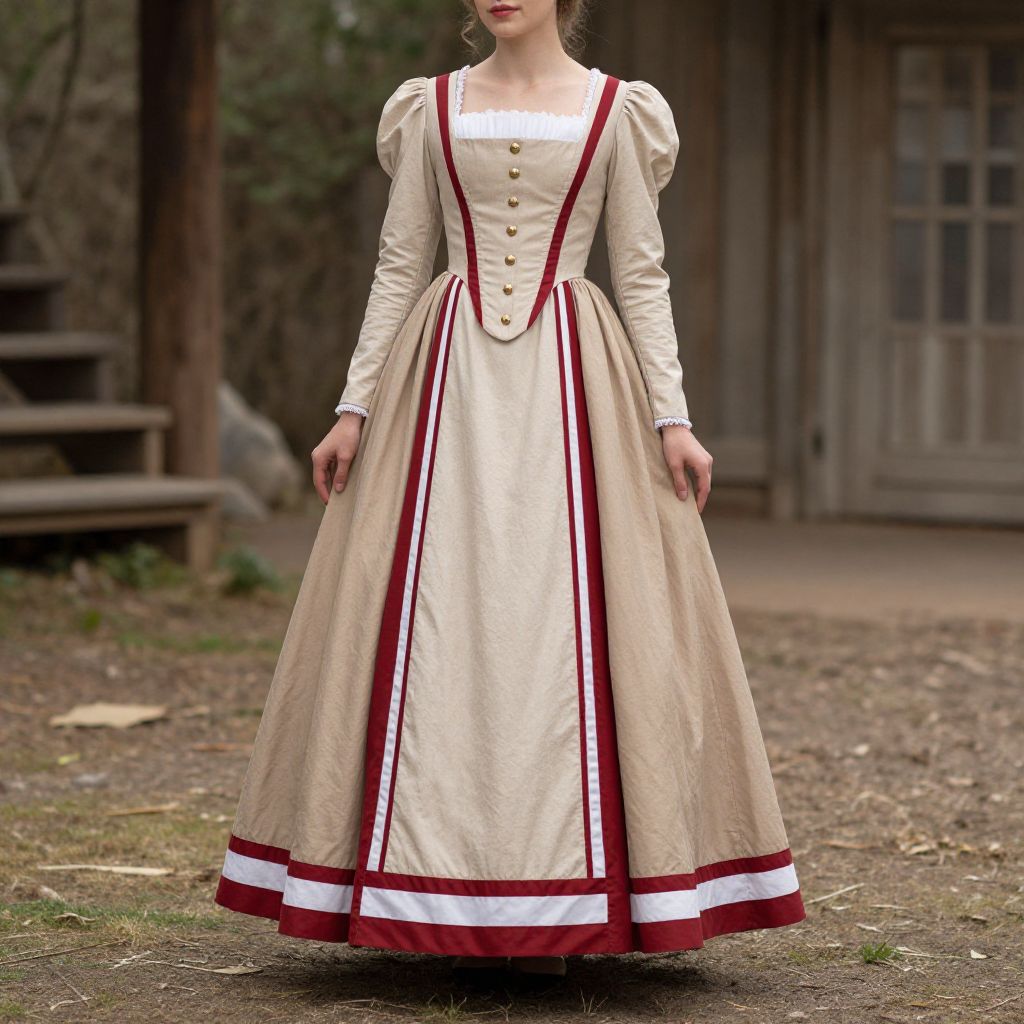 A woman stands outdoors in a full-length historical dress inspired by mid-19th century styles, featuring a fitted bodice with gold buttons, puffed sleeves, and a wide, flowing skirt accented with red and white trim. The setting evokes a natural, rustic environment, enhancing the period cosplay atmosphere.