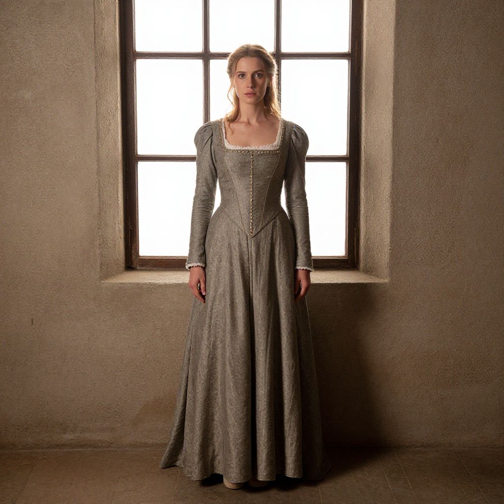Photograph of a young woman in a vintage-style, cream and maroon long-sleeved dress with puffed sleeves, standing outdoors in front of