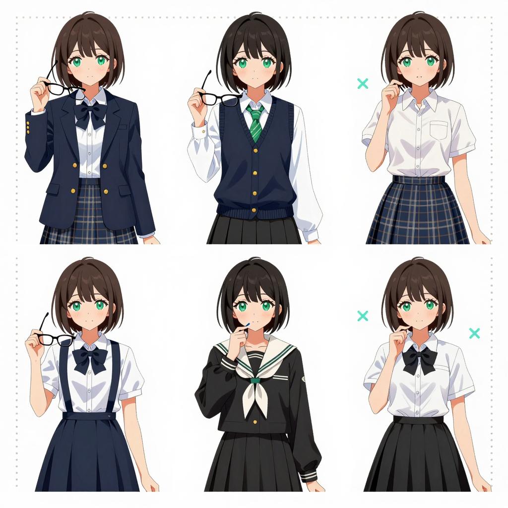 Digital illustration of 40 anime-style girls standing in three rows. Each wears different school uniforms, plaid skirts, blazers, and socks. Many hold backpacks, bags, or umbrellas. Various hairstyles and facial expressions. Background in pink, beige, and blue stripes.