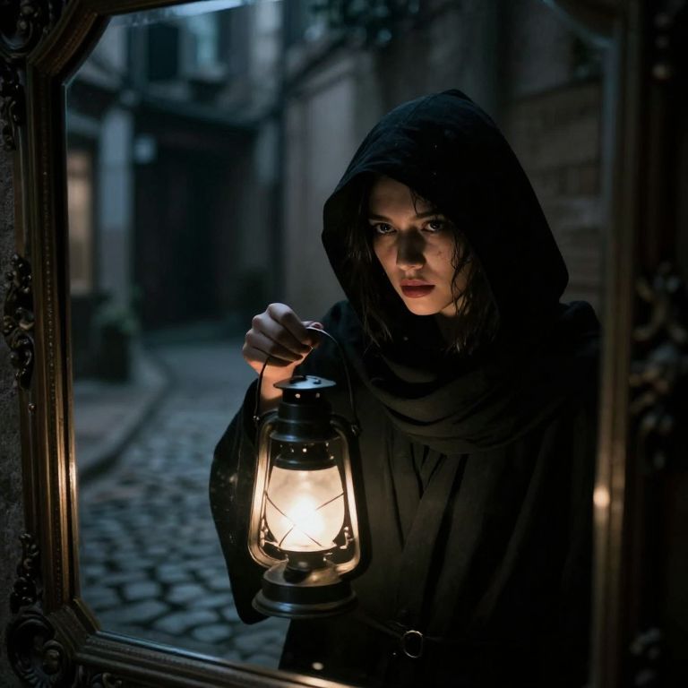 Create a photorealistic portrait reminiscent of high-definition surveillance footage, depicting an enigmatic figure cloaked in shadows, illuminated only by the soft glow of a lantern. Their piercing gaze and slightly parted lips exude intrigue, hinting at an untold story. Framed within an ornate mirror, their reflection distorts surrealistically, akin to a kaleidoscope. The dimly lit alleyway setting intensifies with flickering light casting long shadows across cobblestones, evoking suspense and curiosity.