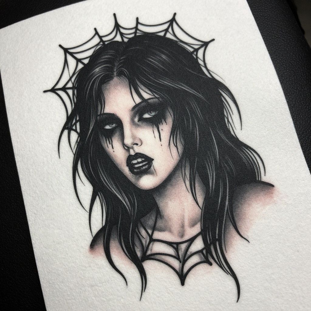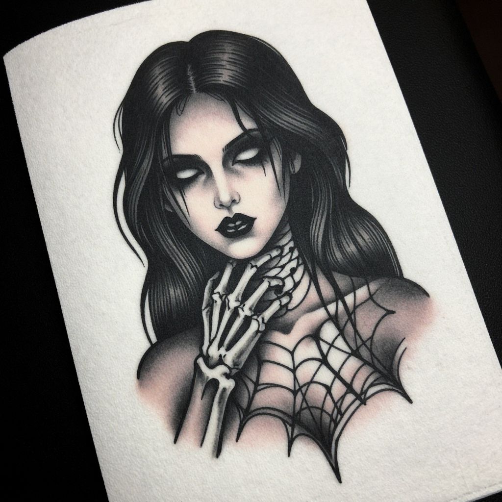 This is a black-and-gray tattoo of a gothic-style woman with long dark hair, pale skin, and dark lipstick. Her eyes are hollow and she has a skeletal hand wrapped around her neck. The tattoo features intricate, web-like patterns extending from her neck up her arm. It's on a white towel, with a dark background. The style is detailed and spooky.
