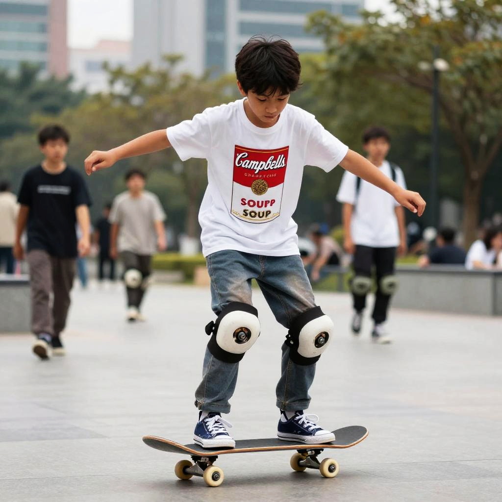 Realistic photo.Campbell's Soup themed photo featuring a teenage boy in a graphic t-shirt, skateboarding in an urban park, captured with depth of field. realistic photo
