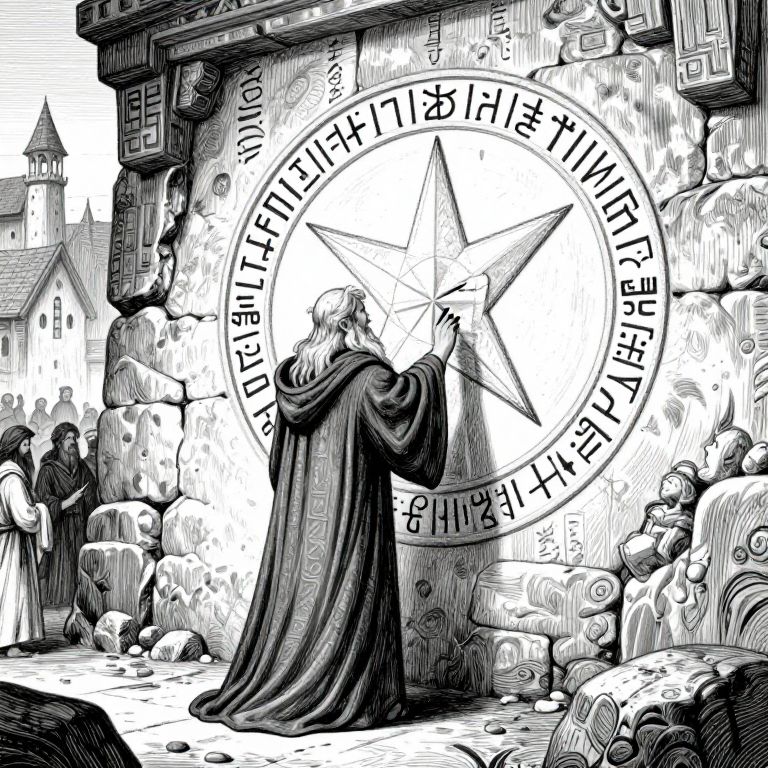 The image depicts a detailed black and white drawing of an ancient wizard standing in front of a carved wall, creating a star with an ancient parchment. The wizard, adorned with a long beard and a flowing robe, is positioned to the left of the star, which is intricately carved into the stone wall. The star is surrounded by hieroglyphs and other symbols, adding to the mystique of the scene. The wall itself is composed of rough, textured stones, giving the impression of an old, ancient monument. The townspeople, though not fully visible, can be seen in the background, suggesting a fantasy world setting. The overall composition is balanced, with the wizard and the star being the central focus, while the townspeople and the detailed wall art provide depth and context to the scene.
