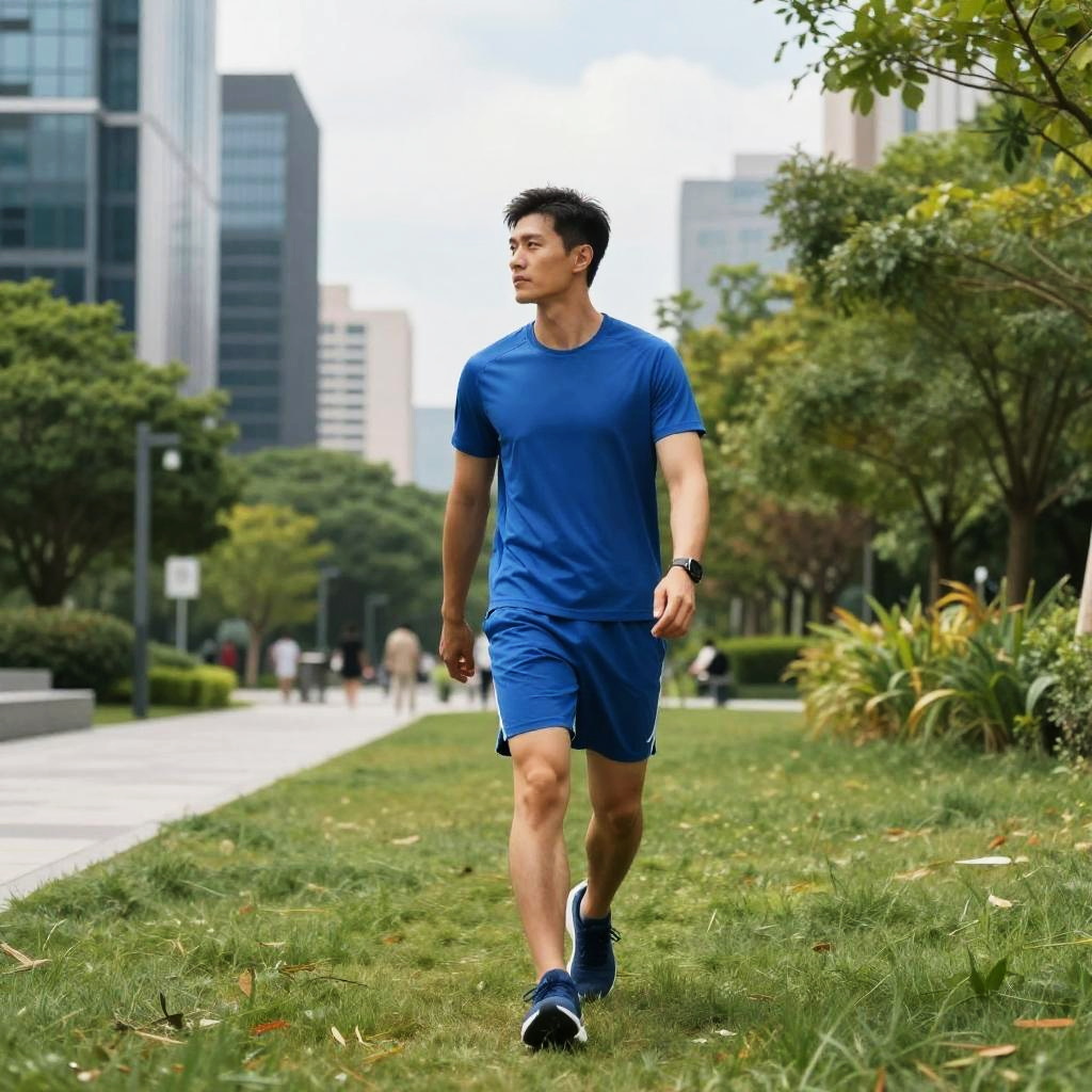 A man is confidently walking through a landscaped urban park, wearing a matching blue athletic outfit. The background features modern buildings and lush greenery under a partly cloudy sky, creating a harmonious balance between nature and city life.