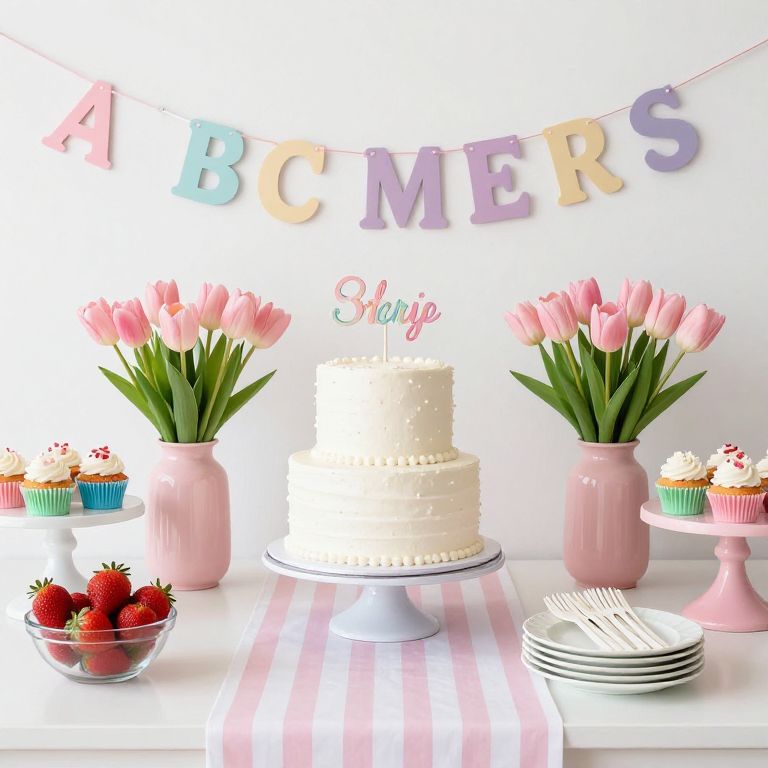 Pastel-themed party setup featuring a two-tiered white cake adorned with decorative toppers, flanked by pink vases filled with tulips, complemented by a banner spelling \"ABC MERS,\" and surrounded by colorful cupcake displays, strawberry bowls, and neatly stacked plates with utensils on a striped runner.