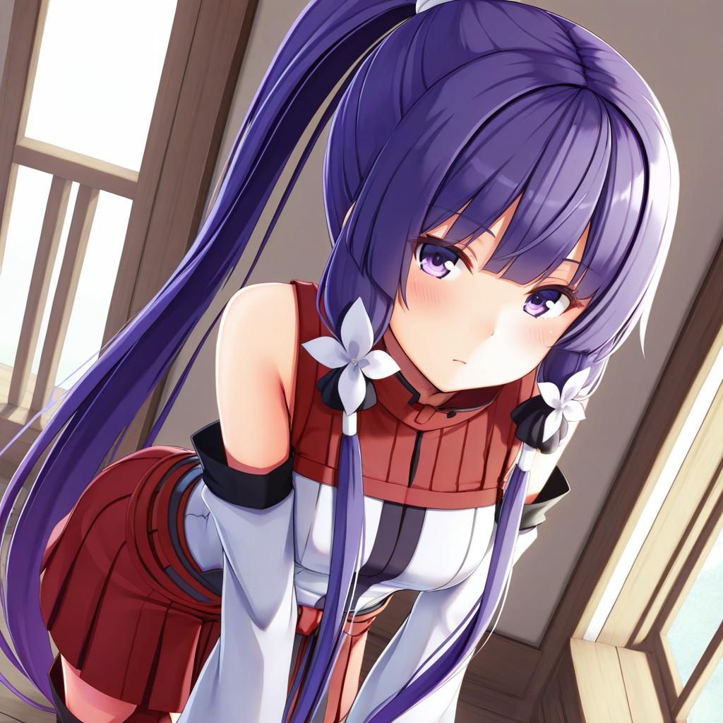 Akatsuki (log horizon), log horizon, 1girl, purple eyes, purple hair, long hair, very long hair, ponytail, detached sleeves, by artist nyan (reinyan 007), illustrious