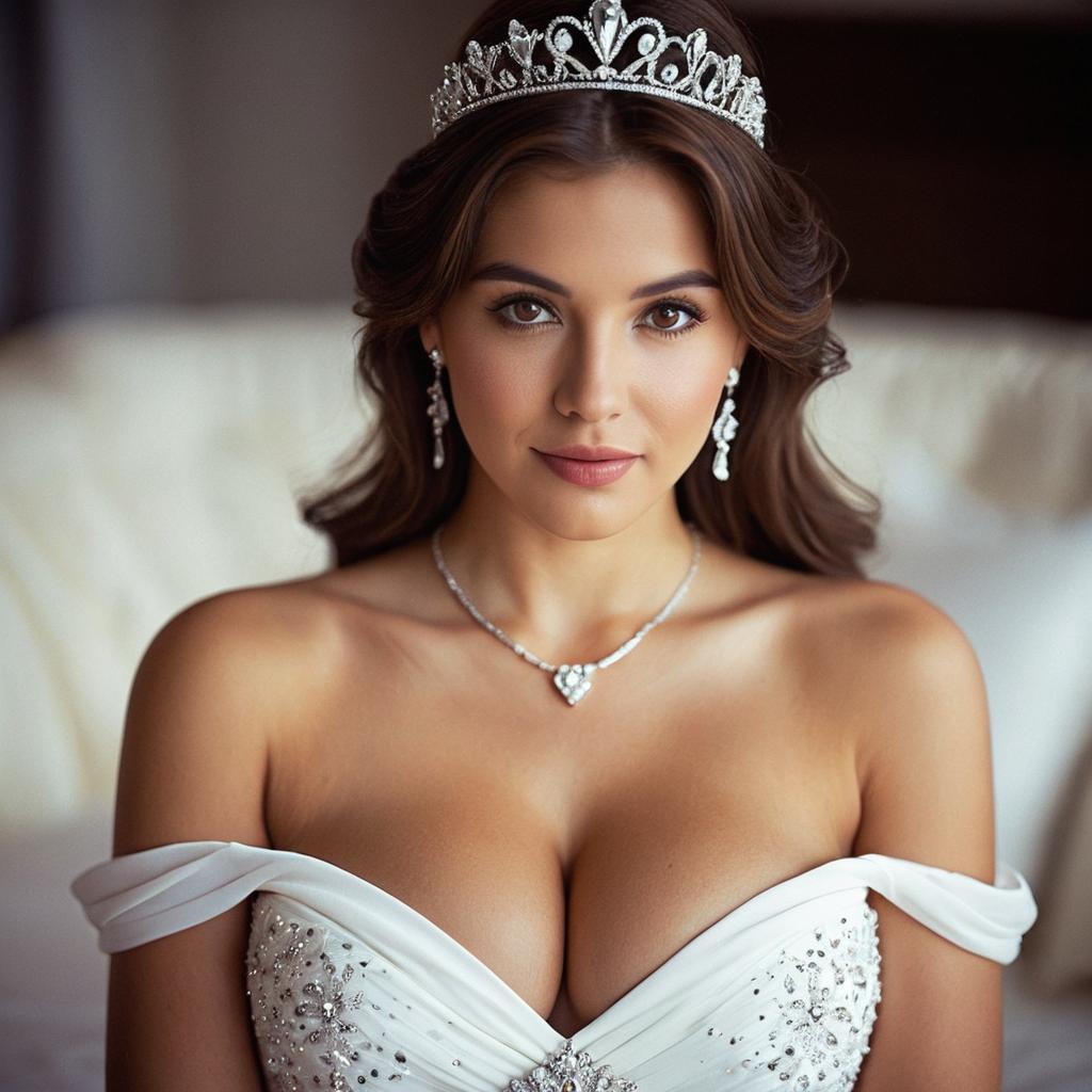 Randy fenoli costume ,1girl, solo, dress, brown hair, tiara, realistic, jewelry, smile, bare shoulders