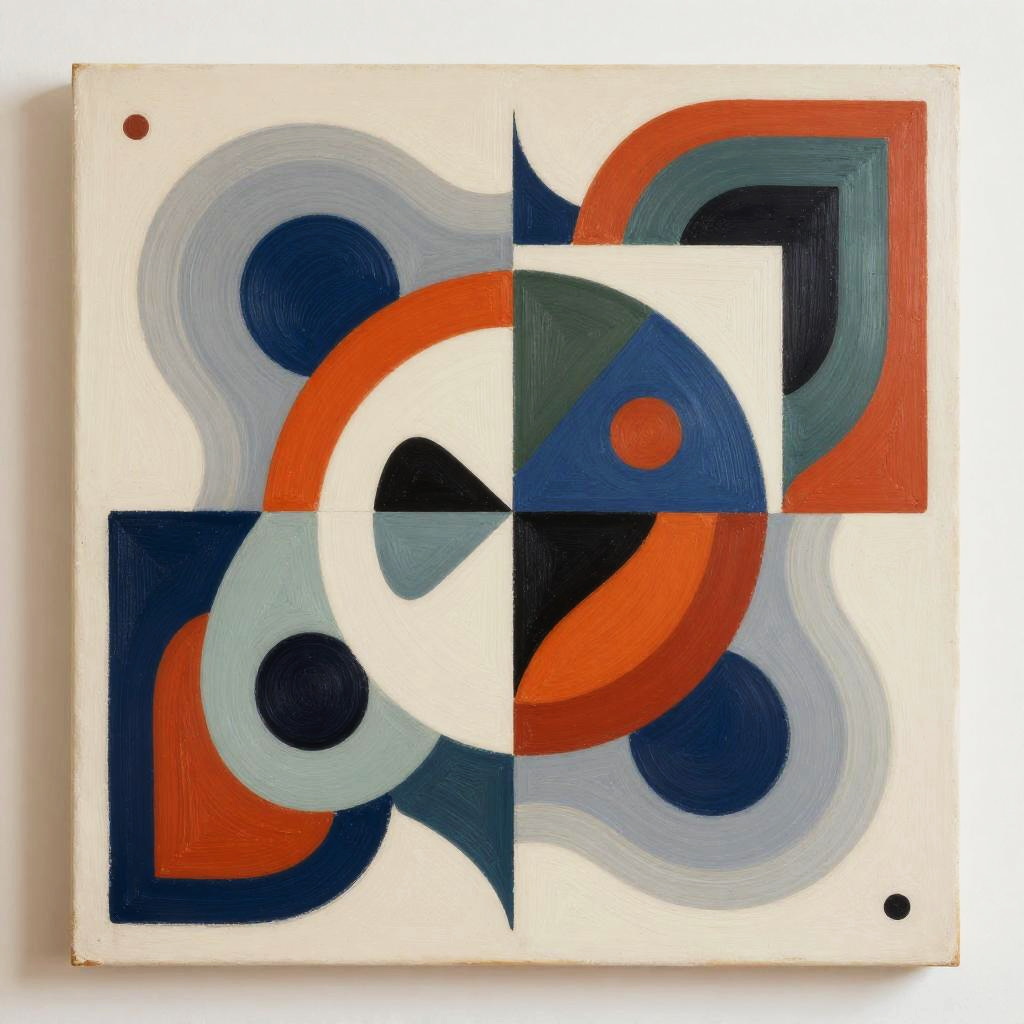 Abstract geometric painting with overlapping circles, curves, and squares in red, blue, gray, and white, divided into four quadrants.
