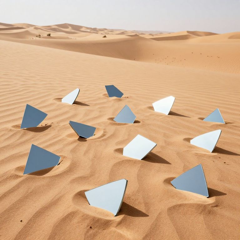 Photograph of a desert landscape featuring eight triangular mirrors with blue and white reflective surfaces. The mirrors are scattered across undulating, sunlit sand dunes with smooth, rippled textures. The bright sunlight casts sharp shadows, emphasizing the dunes' contours. The mirrors are tilted at various angles, creating multiple reflections of the surrounding sand. The sky above is clear and pale blue, contrasting with the golden-brown hues of the sand. The overall composition is minimalistic, focusing on the interplay between natural and reflective elements.