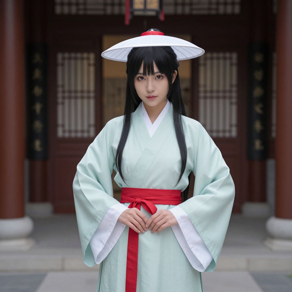 Photograph of an East Asian woman standing in front of a traditional Japanese building with wooden doors and red columns. She has long black hair, straight and parted in the middle, and wears a white kimono with wide sleeves and a bright red obi (belt) tied around her waist. Her wide-brimmed white hat with a red band is slightly tilted. She has a fair skin tone and a calm expression, with her hands resting in front of her. The background includes blurred architectural details and a stone pathway. The image has a soft focus effect, adding a gentle, serene atmosphere.