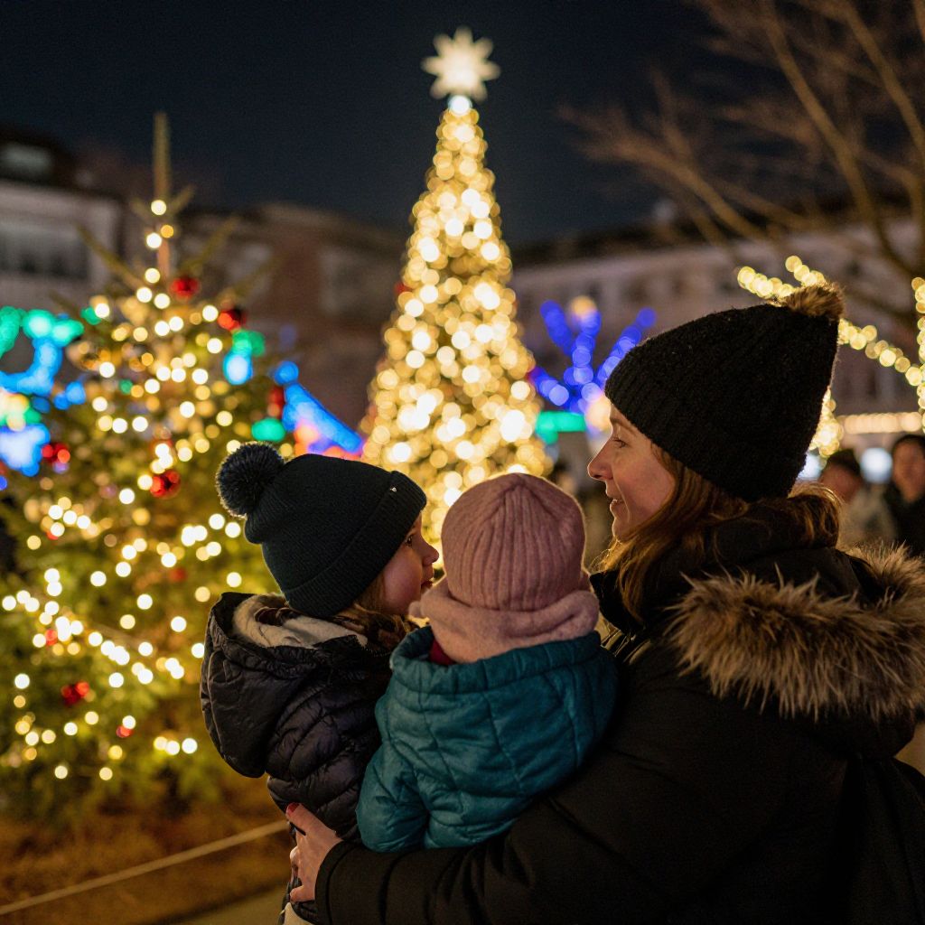 Woman and Child Enjoying Christmas Lights