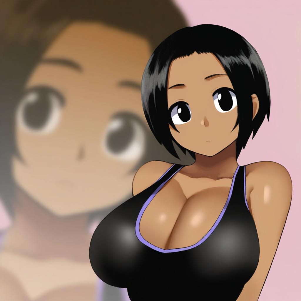 Arung samudra (cessa), ombok diving and delivery services, 1girl, dark-skinned female, black eyes, black hair, short hair, large breasts, cleavage, by artist ya-man, leet