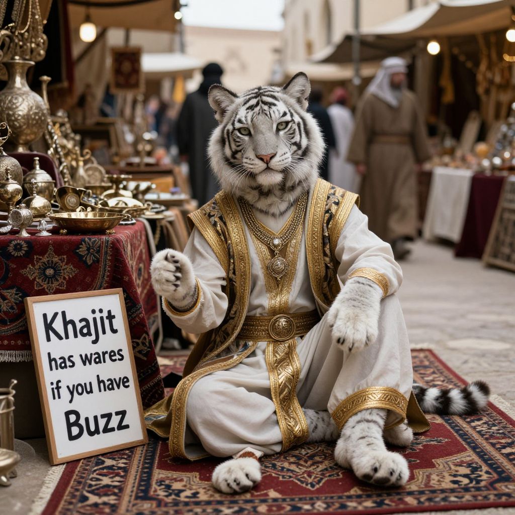 Photograph of an anthropomorphic white tiger with black stripes, wearing an ornate, gold-trimmed white robe, seated on a red patterned rug in a bustling outdoor market. The tiger has one paw raised in a welcoming gesture. To the left, a sign reads "Khajit has ware if you have Buz." Background includes blurred market stalls, golden decor, and a person in a tan robe. Warm, natural light highlights the scene. The tiger's detailed fur and expressive eyes contrast with the intricate, colorful market surroundings.