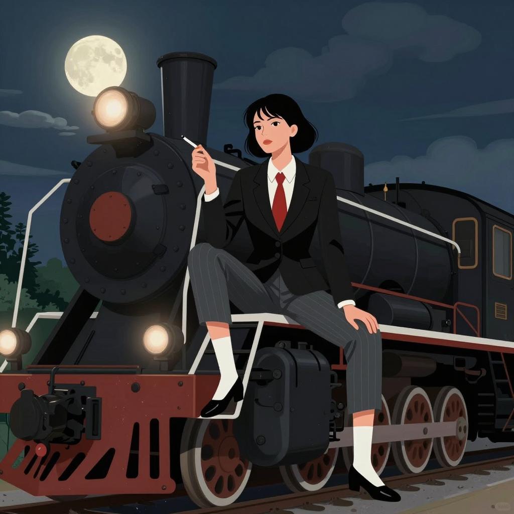 Illustration of a woman with short black hair, wearing a black suit, white shirt, red tie, gray pinstriped pants, and white socks. She sits on the front of a large, dark, steam-powered train at night. Moonlight shines above, illuminating her calm expression. Her right hand holds a cigarette, while her left hand rests on her knee. Train headlight is on the left side of the train's front. Clouds and trees in the background. She is centered, with legs crossed. Two visible wheels below her.