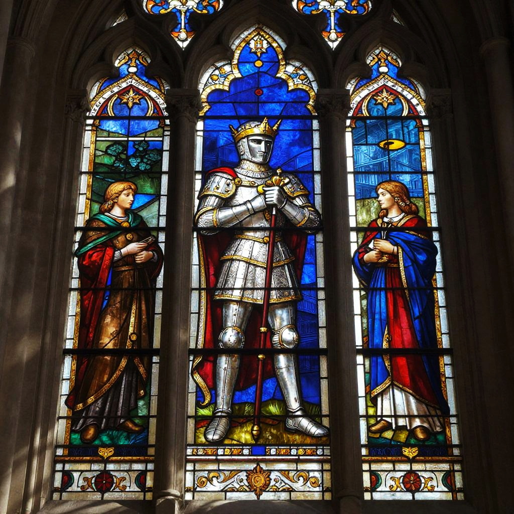 Knight emblem on a stained glass window inside a grand cathedral, vibrant colors shining through, detailed lead outlines, dramatic light and shadow contrast, art nouveau style