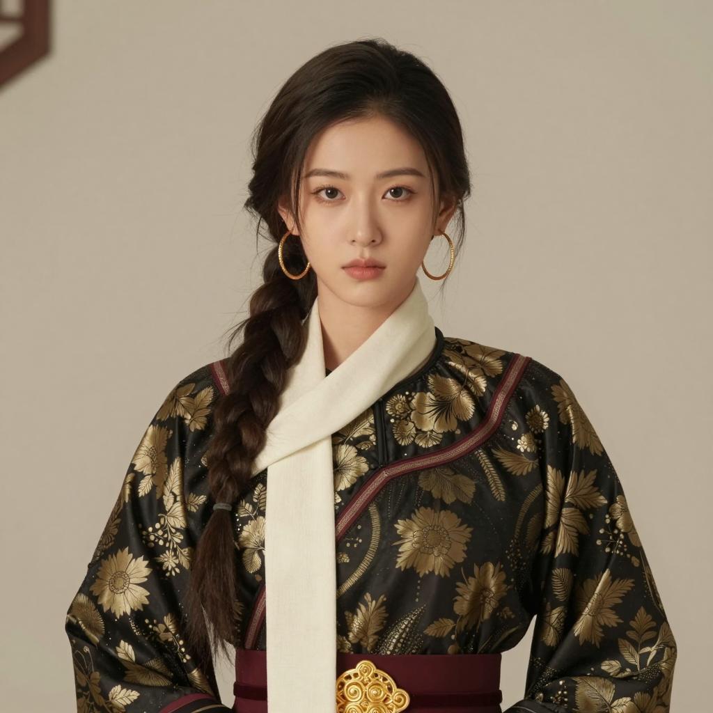 Adult sully costume, digital art, realistic style, young East Asian woman, center frame, straight gaze, black hair in bun, red hair accessories, brown silk kimono, high collar, long sleeves, gold necklace, detailed background, ornate gold and red patterned wall, soft light, warm colors, subtle shadows, elegant, traditional Japanese attire, symmetrical composition, close-up, portrait, slight blush on cheeks, red lipstick, calm expression, refined beauty