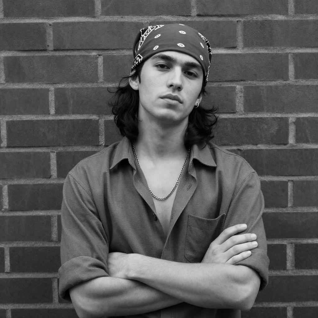 Black-and-white photograph of a young man with long dark hair wearing a bandana, an open button-up shirt with rolled sleeves, and a chain necklace. He poses with a serious expression, arms crossed, standing slightly angled to the left against a textured brick wall background.