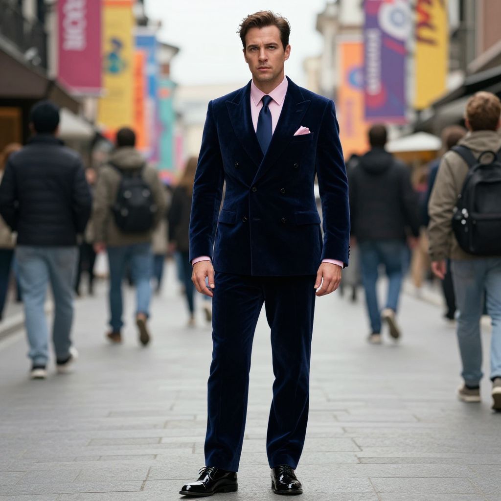 A man, midnight blue velvet double-breasted suit, pale pink dress shirt, navy silk tie, black patent leather shoes, contrasting pink pocket square, vibrant terminal, colorful banners, bustling travelers, cinematic film style, confident expression. Man has masculine face and piercing eyes