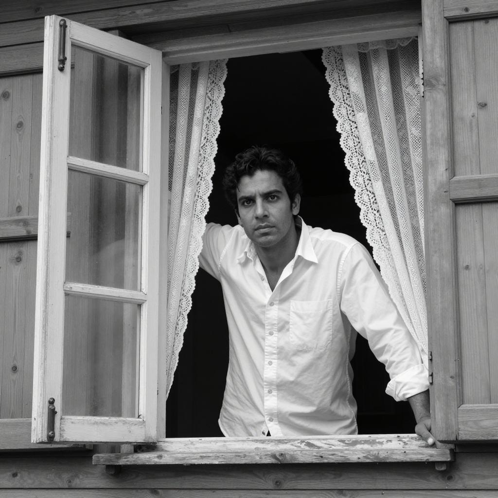 Black-and-white photograph of a man with dark hair, serious expression, wearing a white shirt, leaning slightly forward through an open window with lace curtains. Wooden siding on either side. Man's right arm extended outward.