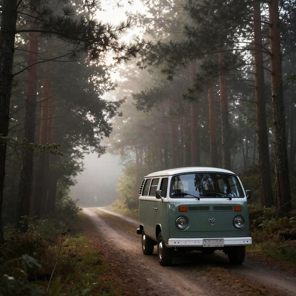 Vintage van driving away through a misty forest path, early morning light filtering through tall pine trees, soft fog, moody atmospheric perspective, rustic and nostalgic vibe, sharp details on the van and surrounding nature