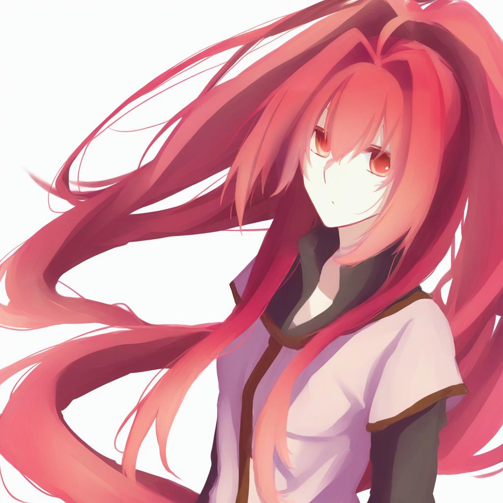 Digital anime-style illustration of a female character with very long red hair styled in a ponytail with ahoge and hair intakes. She has red eyes and is wearing a white and black outfit. The character portrays a serene expression and is rendered with smooth shading and soft color gradients on a plain white background.