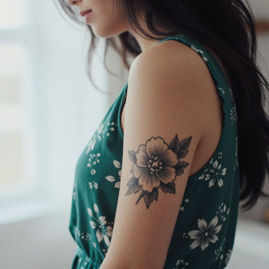 Photograph of a young woman with long dark hair, viewed from the side, focusing on her left upper arm. She wears a sleeveless, dark green dress with white floral patterns. Her arm features a detailed black and gray floral tattoo, depicting a large flower with multiple petals and leaves. The background is softly lit with a bright white light source on the left, creating a gentle contrast with her dark hair and tattoo. The image emphasizes the intricate design and texture of the tattoo against her light skin.