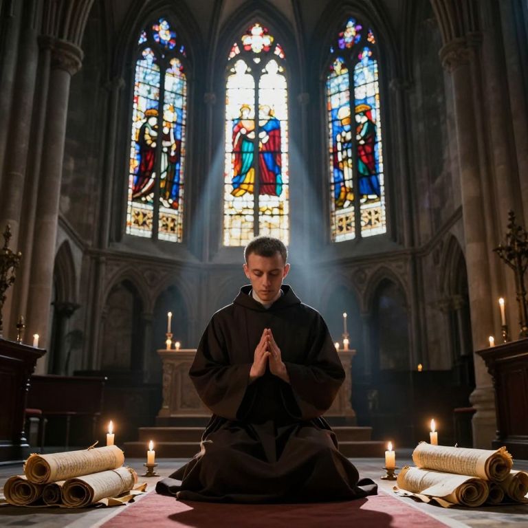Redemptionist monk praying in a dimly lit ancient cathedral, beams of light filtering through stained glass windows, surrounded by old scrolls and candles, serene and solemn atmosphere, detailed gothic architecture.