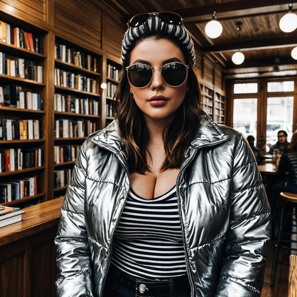 Leather Jacket Street Style, waist-up portrait of a big breasted woman posing indoors with large sunglasses pushed up on her head. She wears a fitted lace bodysuit and a simple, fitted black denim jacket. The background features vintage American diner counter with neon signs. Edgy chic, photorealistic, 8k, detailed leather texture.