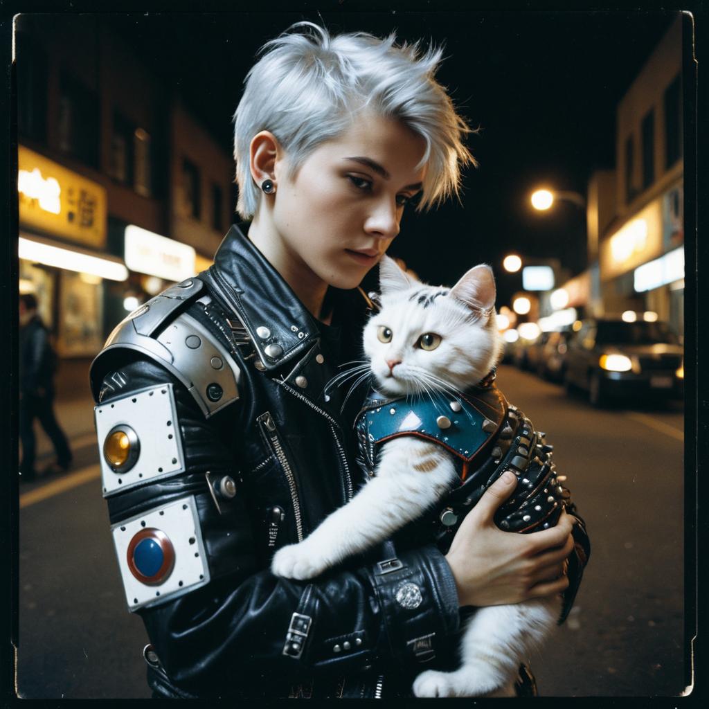 An eccentric beautiful blue-haired boy mecha-pilot wearing a graphic t-shirt and cargo pants, hugging a robotic owl, in a tech street. Cinematic lighting. Dramatic nighttime. Polaroid 3200dpi scan, medium format film Portra 800.