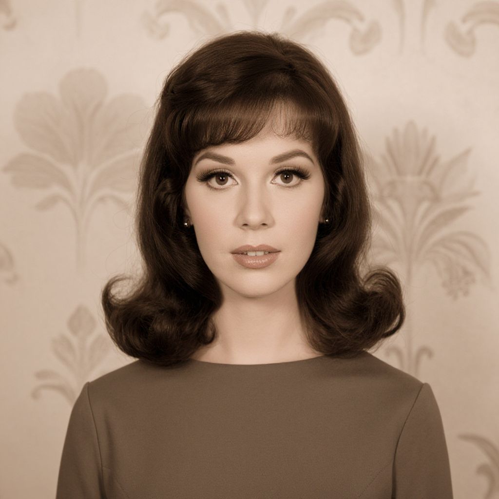 A vintage 1960s inspired portrait of a woman with shoulder length hair brunette, styled with soft curls and side bangs, muted sepia tones, classic makeup look, standing against a retro wallpaper background with floral patterns
