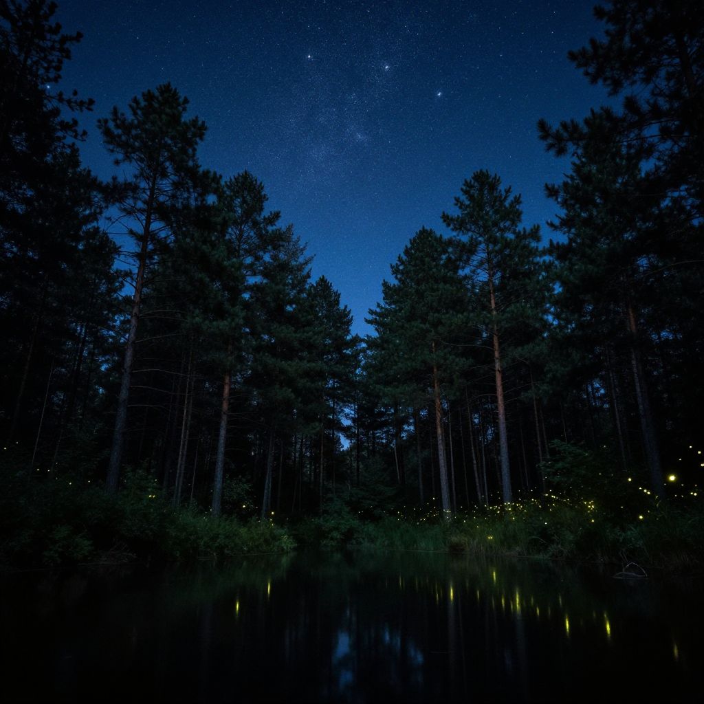 Starry night images showcasing a majestic pine forest bathed in moonlight, with countless twinkling stars illuminating the sky, detailed with soft glowing fireflies and a calm lake mirroring the star-filled heavens in photorealistic style.