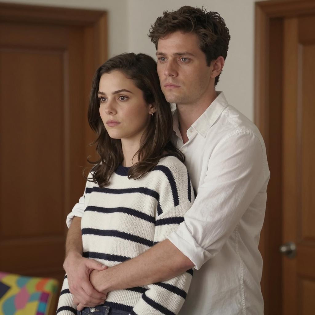 Two people in a dimly lit indoor setting. Man on left with dark hair, unbuttoned blue shirt, cigarette in mouth, looking at woman. Woman on right with brown wavy hair, tan turtleneck, looking back at man. Background is blurred with wooden stairs. Man's expression is neutral, woman's expression is focused.
