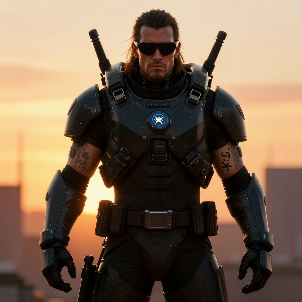 Digital painting of a battle hardened male Cyberpunk warrior, heavy military police armor, long hair, (tattoos:0.7), cybernetic implants, sunglasses, (facing the camera:1.5), cinematic, cinematic color grading, backlit, at sunset, sharp focus