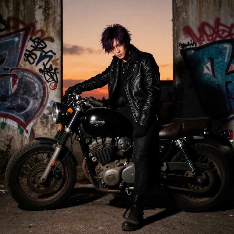 Dark purple hair guy wearing leather jacket, sitting on an old motorcycle against a sunset backdrop, urban grit with graffiti walls, rugged and mysterious vibe, sharp shadows, high contrast colors