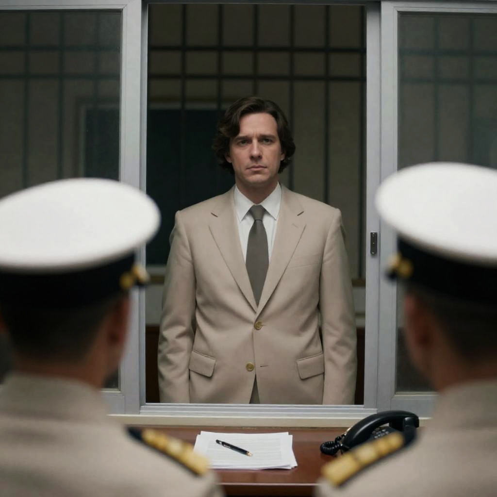 Photograph of a man with medium-length brown hair in a beige suit, white shirt, and tie, standing behind a glass window. A naval officer with a white cap and uniform seen from behind. Desk with papers, pen, and telephone in front. Metal bars on window. Man has neutral expression. Naval officer's back to camera. Dimly lit, indoor setting.