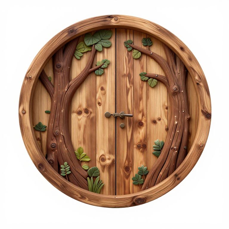A round wooden fairy door featuring a detailed woodland theme with carved tree trunks and green leaves. The door is crafted from natural wood with a circular shape and a small metal handle and lock, designed to evoke a whimsical forest entrance.