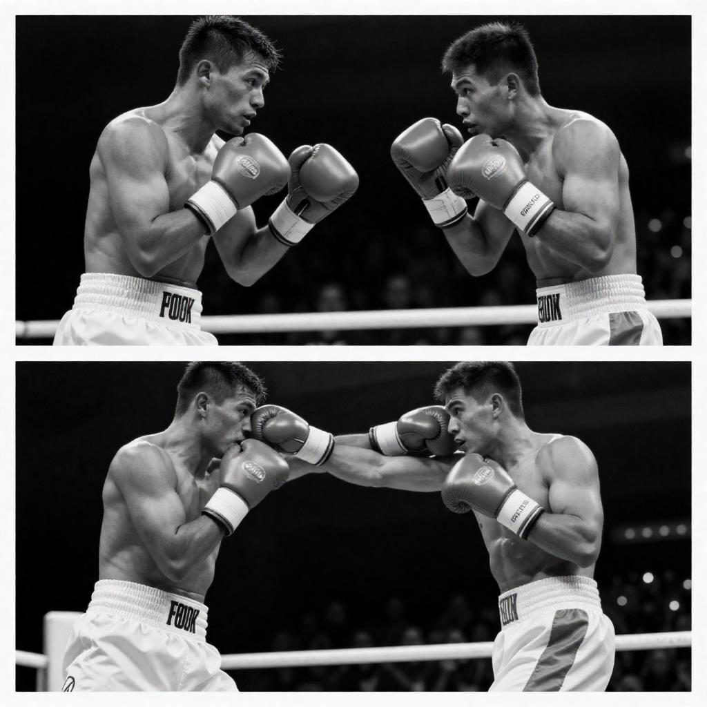 Black-and-white photograph of two male boxers in white trunks. Top image: one boxer in a defensive stance, the other in an aggressive stance. Bottom image: one boxer in mid-air, being punched by the other. Intense facial expressions. Background includes blurred audience and lighting.