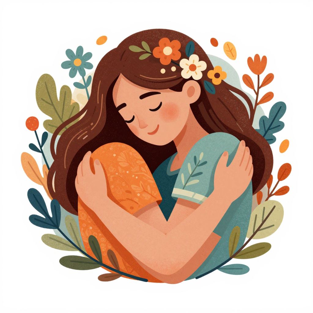The image is a vibrant, stylized illustration of a woman hugging herself, exuding a sense of warmth and self-love. The woman's face is adorned with a gentle smile, and her eyes are closed, suggesting a moment of contentment and peace. Her hair, a rich brown, is decorated with colorful flowers and leaves, adding a touch of nature to her appearance. The background is a harmonious blend of warm and cool colors, including shades of orange, green, and blue, creating a balanced and inviting atmosphere. The illustration is clean-lined and vector-based, with a folk art aesthetic that gives it a timeless quality. The background is transparent, allowing the viewer to focus on the woman and her floral adornments. The overall composition is dynamic, with the woman's arms forming a circular shape that draws the viewer's eye around the image. The interplay of colors, textures, and shapes creates a visually rich and emotionally resonant scene.