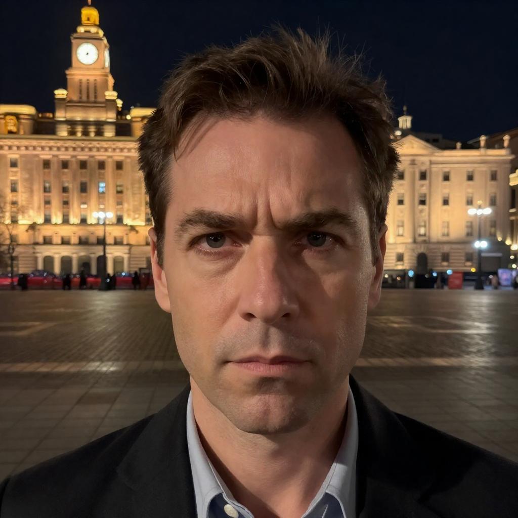 Photograph of a white man with short brown hair, wearing a black cardigan, white shirt, and brown patterned tie. He holds a sign with a blue sky, snowflakes, and the word "Natural" in his right hand. Background is a plain white wall with a partial blue and yellow object on the right. His expression is neutral.