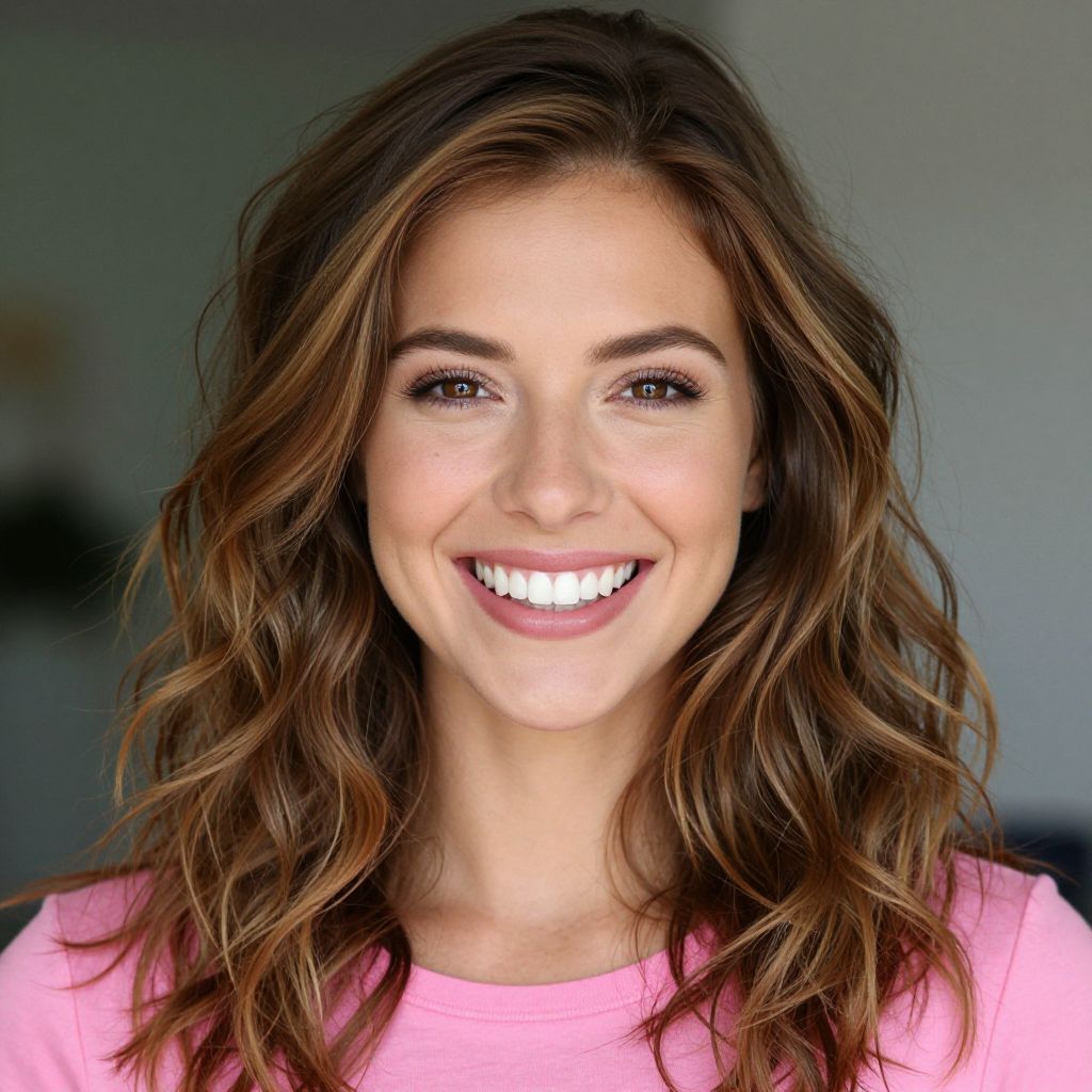 Photograph of a smiling woman with wavy, shoulder-length brown hair and light brown highlights. She has a radiant, bright white smile showing her teeth and is wearing a pink shirt. The background is softly blurred with green and blue tones, making her the clear focus of the image. The lighting highlights her face, giving her a glowing appearance.