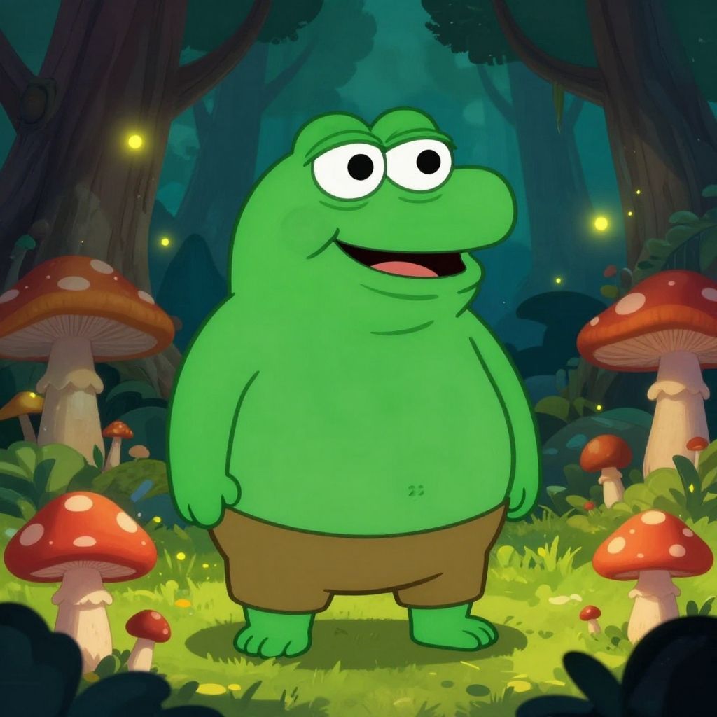 Fat pepe meme as a jovial character in a fantasy forest, plump and round body, mischievous smile, surrounded by colorful mushrooms and glowing fireflies, whimsical art style