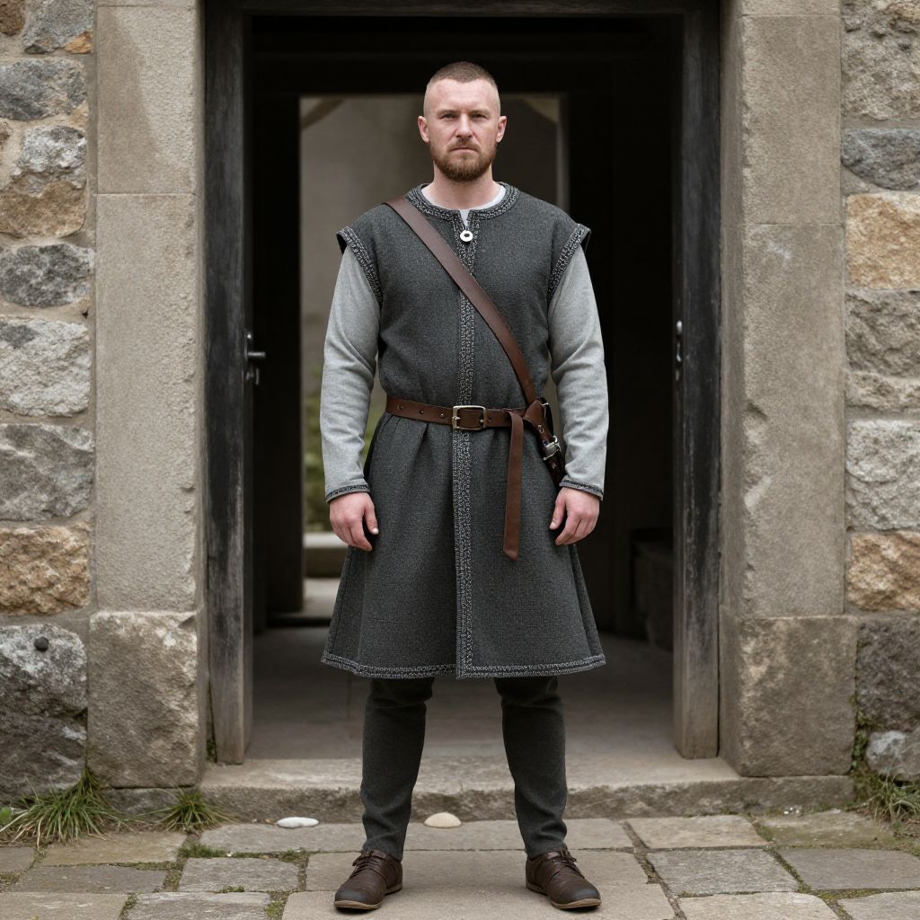 Historical Viking Costume, man in medieval clothing standing in front of a doorway