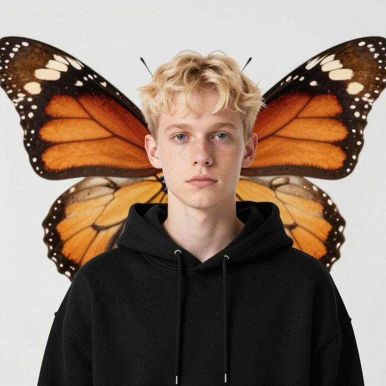 Boy with blonde hair and a black hoodie. He is standing in front of a butterfly with orange and black wings.
