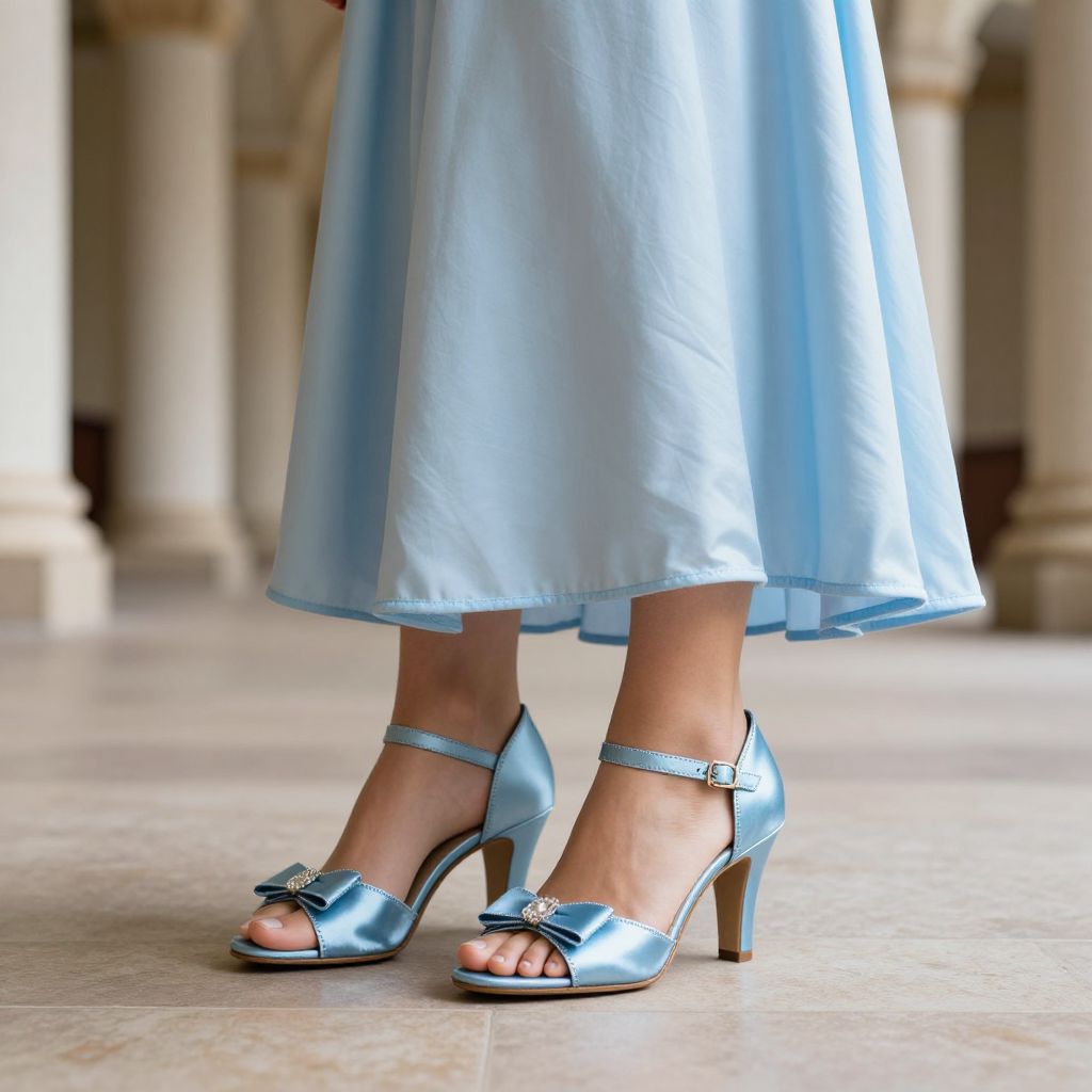 Goddess costume shoes, a woman in a blue dress standing in a hall with columns