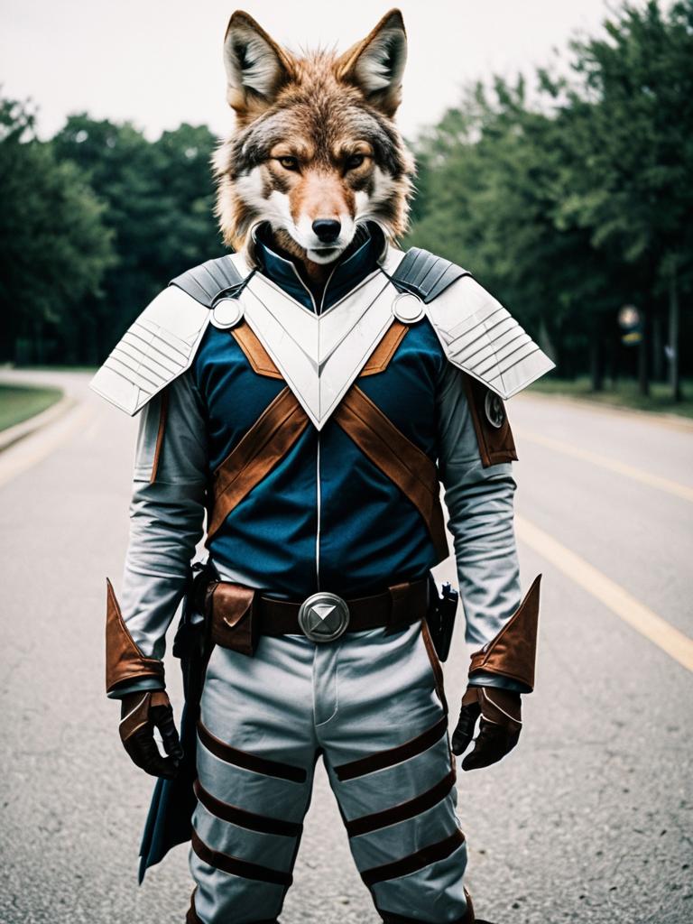 A man wearing a realistic Coyote Starrk cosplay costume featuring a coyote head mask and detailed armor with white and green accents, brown gloves, and a matching belt. The photo is taken outdoors in a woodland area with bare trees and dry grass.