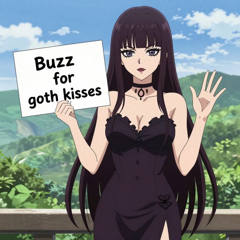 Anime, 2d, goth female, solo, flat chest, goth sexy clothes, straight dark hair with bangs, heavy eyeliner, standing, long hair, bangs, landscape background, holding a white sign with black text that reads \"Buzz for goth kisses\" on it