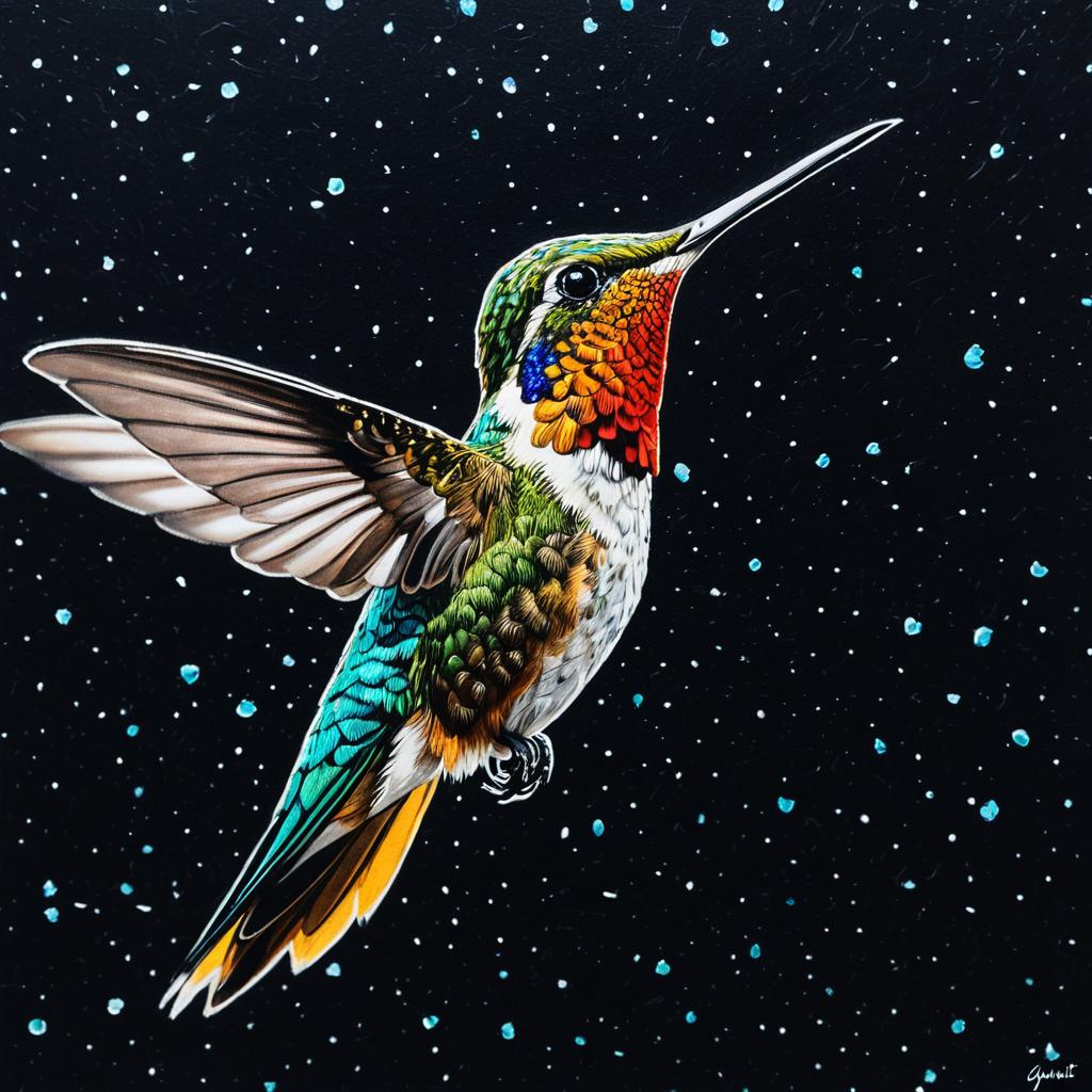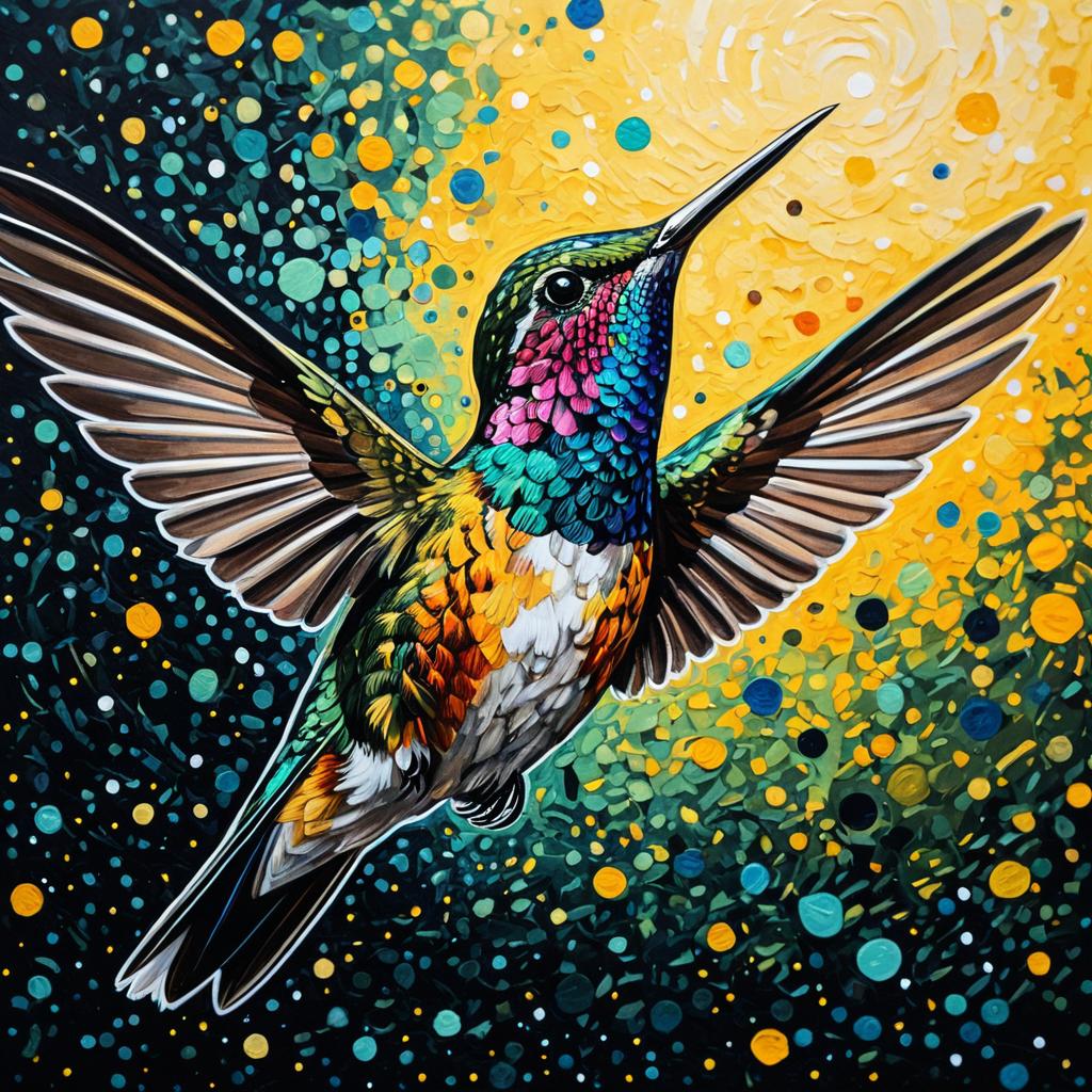 A colorful hummingbird, best quality, cinematic lighting, drawn art, clip studio paint, impasto, acrylic, high contrast, colorful, ultra-detailed, Gustav Klimt inspired