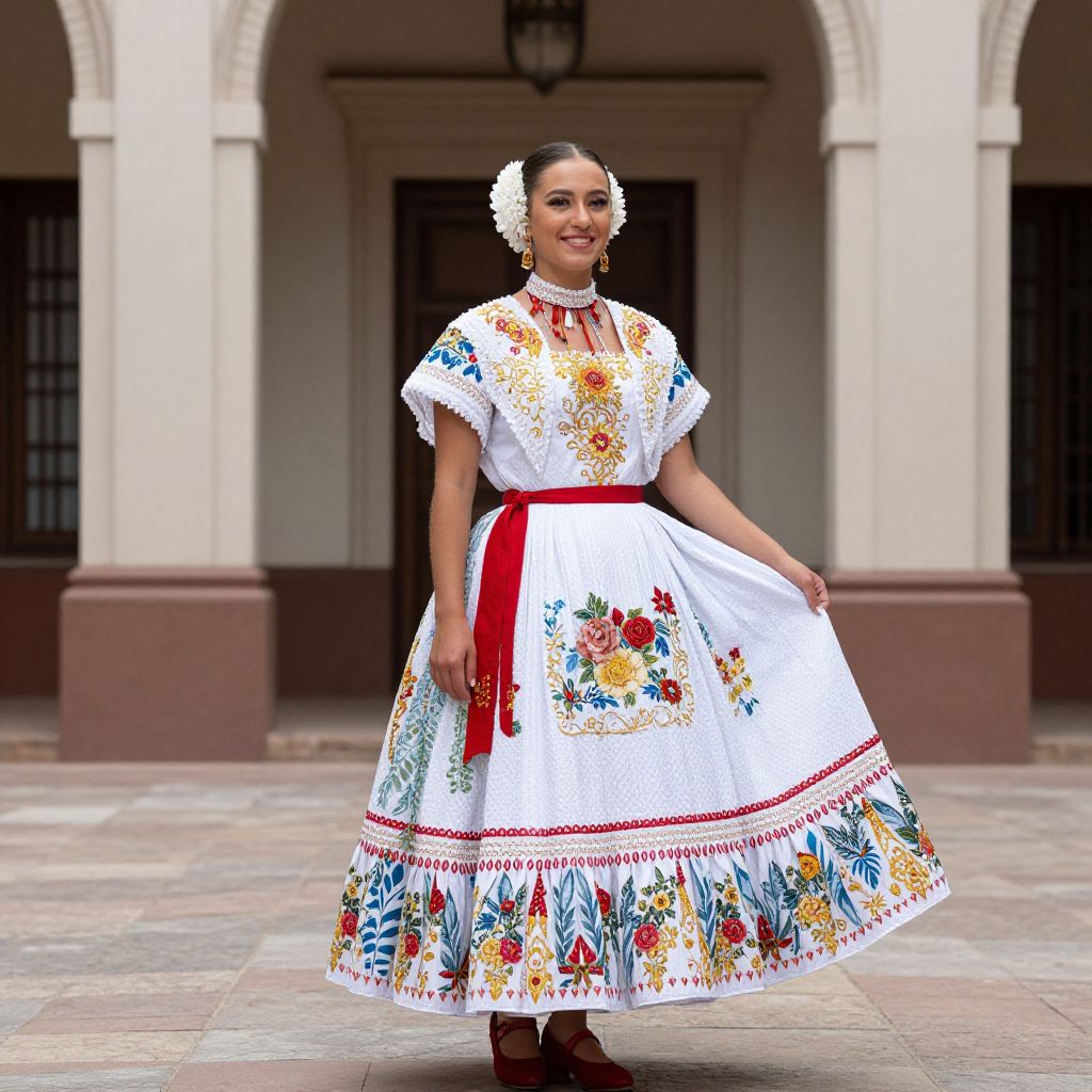 Photograph of a smiling woman with light brown skin and dark hair, styled in a bun adorned with a white floral hairpiece. She wears a traditional white embroidered dress with colorful floral patterns, a red belt, and a red neckerchief. The dress features short sleeves and a full skirt. She stands on a tiled patio with white and brown stone arches in the background. She wears brown shoes and has white pearl earrings. The bright, colorful embroidery contrasts with the white fabric and red accents, creating a vibrant, festive look.