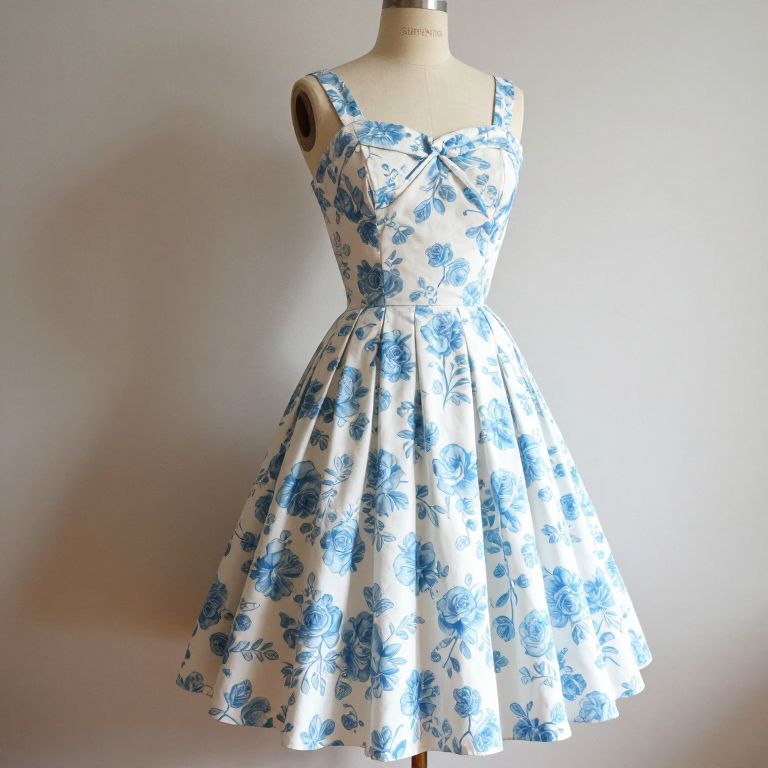 Vintage Laura Ashley cotton dress featuring a ditsy rose print in blue floral design, strappy shoulders, and a flared skirt, showcasing an 80s interpretation of 1950s prairie style, displayed on a mannequin labeled \"SURPÉNTIO.\